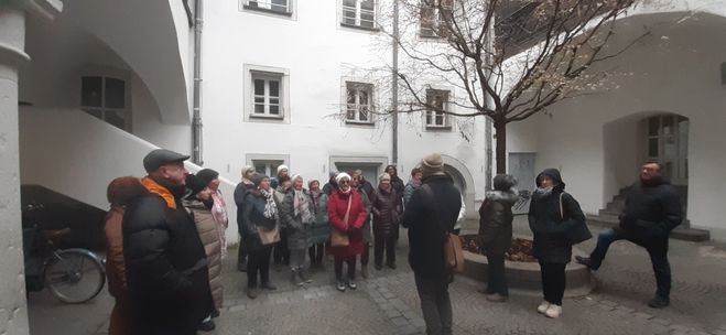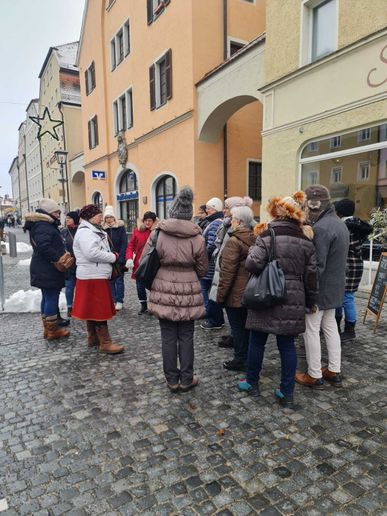Das Ziel der diesjährigen Christkindlmarkt-Fahrt war Regensburg. Bei Ankunft erwartet die Teilnehmerinnen und Teilnehmer eine 90minütige Stadtführung. Gestartet wurde in zwei Gruppen am Stadt am Hof, über die Steinerne Brücke zur Altstadt. Vorbei ging es am Goliath-Haus zum alten Rathaus. Erklärungen gab es auch zu einem imposanten Gebäude im italienischen Stil, das einmal einer reichen Kaufmannsfamilie gehörte. Zu diesem Haus gehört auch ein 50 Meter hoher Turm. Die reichen Leute bauten sich hohe Türme, um so ihren Reichtum zu zeigen. Der Fussmarsch ging weiter über den Lucrezia-Markt, Kohlmarkt zum Neupfarrplatz, wo man schon die Buden der verschiedenen Märkte sehen konnte. Durch enge Gassen ging es in Richtung Dom und das Ende war bei der Wurstkuchl an der Donau. Es gab viele Geschichten zu den verschiedenen Christkindlmärkten und deren Entstehung. Im Anschluss an die Führung hatte jeder genügend Zeit die einzelnen Märkte zu erkunden und sich eine Bratwurstsemmel und einen Glühwein schmecken zu lassen. Vor der Heimfahrt konnte man sich noch einmal beim Weihnachtsmarkt im Spitalgarten stärken.