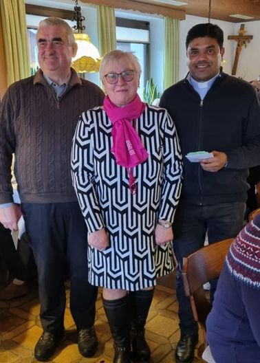Am 1. Adventsonntag feierte der Frauenbund seine Adventfeier. 1. Vorsitzende Angelika Vogl freute sich sehr über den zahlreichen Besuch. In der Begrüßung hieß sie besonders geistlichen Beirat Stadtpfarrer Alfons Kaumann und Kaplan Chinna Dola herzlich willkommen. Die Feier hatte das Thema: "Wenn Flügel dich berühren". Mitglieder der Vorstandschaft lasen die Texte der verschiedenen Engel und die Gruppe "Allerhand Saiten" gestaltete die Feier musikalisch. Am Ende des besinnlichen Teils übergab Vorsitzende Angelika Vogl eine Spende von 500 Euro für Pfarrer André, stellvertretend an Stadtpfarrer Alfons Kaufmann, und eine Spende von