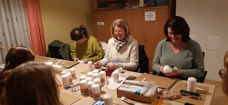 Viele Frauen fertigten am 27. Februar über 40 Osterkerzen im evangelischen Gemeindesaal. Der Verkauf findet am 21./22. März vor und nach den Gottesdiensten statt. Der Erlös ist für einen caritativen Zweck bestimmt.