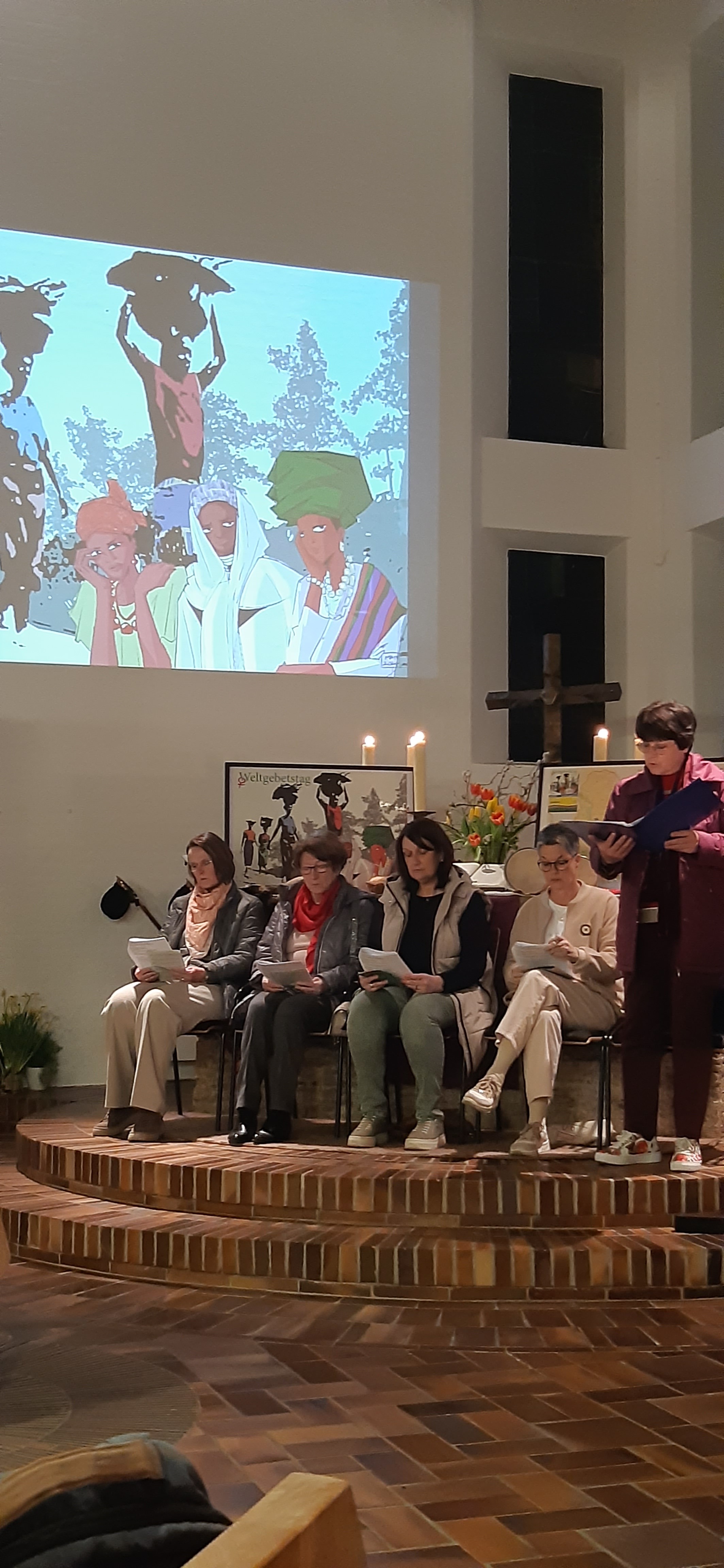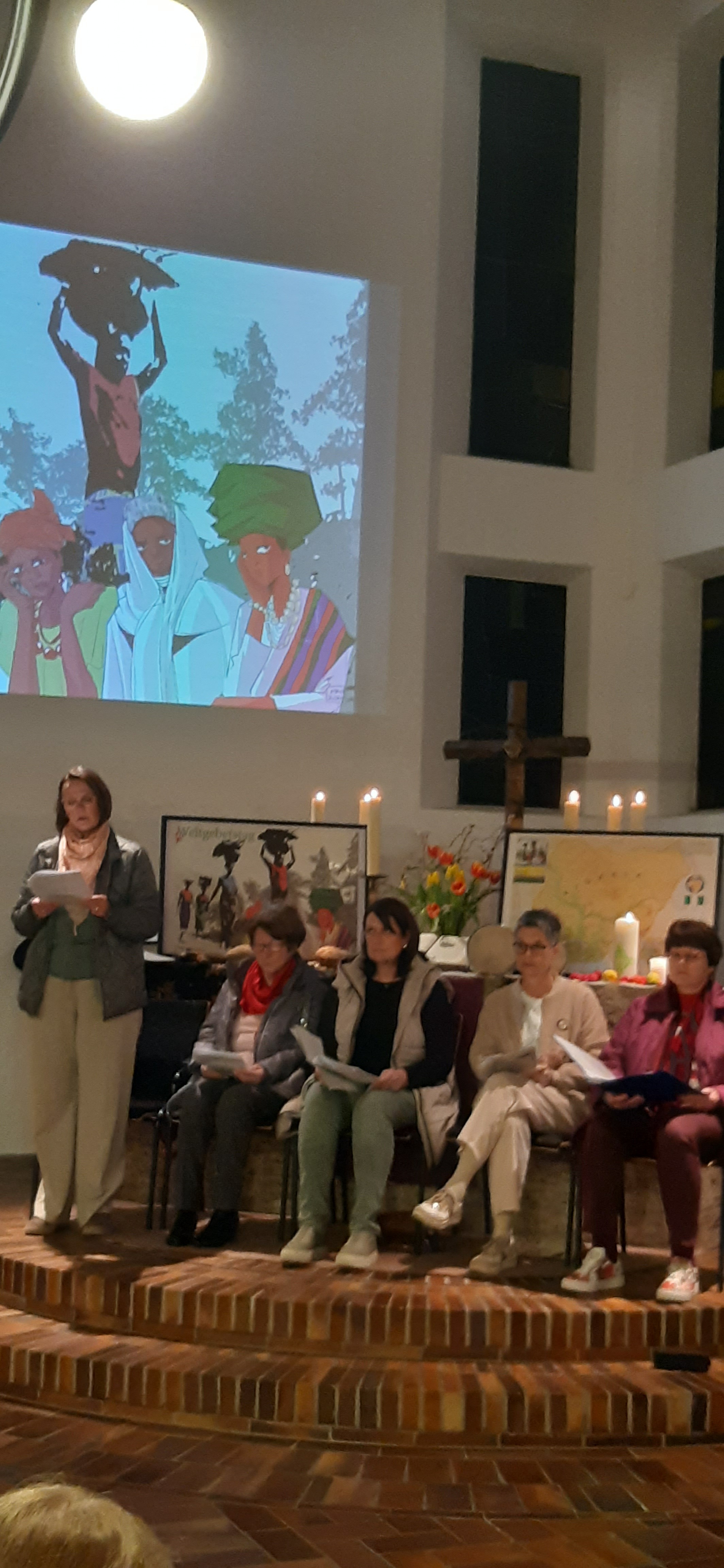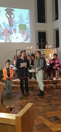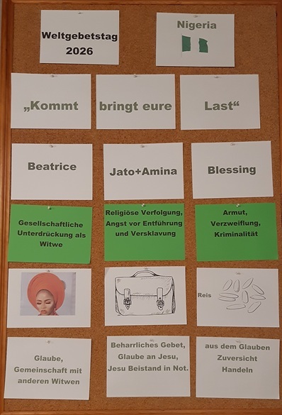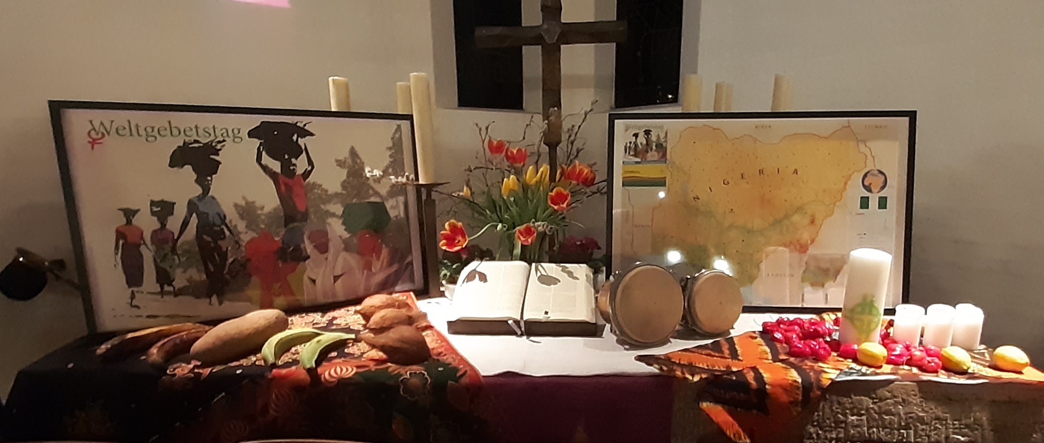 Zum Weltgebetstag der Frauen wurde in die evangelische Kirche eingeladen. Der ökumenische Gottesdienst wurde von Frauen beider Konfessionen gestaltet. Nigerianische Frauen haben den Weltgebetstag unter dem Motto: "Kommt! Bringt eure Last" vorbereitet. Drei verschiedene Frauen erzählten die Geschichte von Beatrice, Jato und Blessing. Zur Kollekte wurde zu rhytmischer nigerianischer Musik nach vorne getanzt, um die Opfergabe abzugeben. Nach dem Gottesdienst klang der Abend mit leckerem nigerianischem Essen und regen Gesprächen aus.